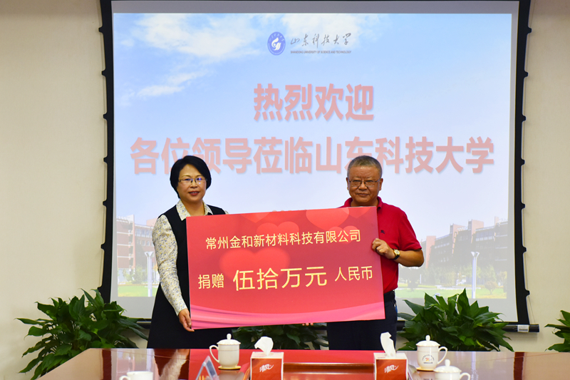 捐赠仪式上,科技处处长陈连军与常州金和新材料科技有限公司党支部书记钱雪忠代表双方签订捐赠协议。常州金和新材料科技有限公司出资50万元支持学校教育事业发展。李玉霞代表学校接受捐赠并回赠捐赠证书,向栾润东颁发必一体育在线平台(中国)官网兼职教授聘书。