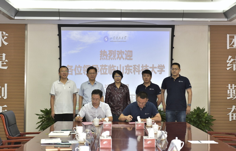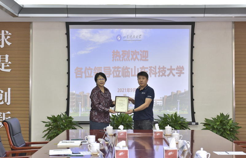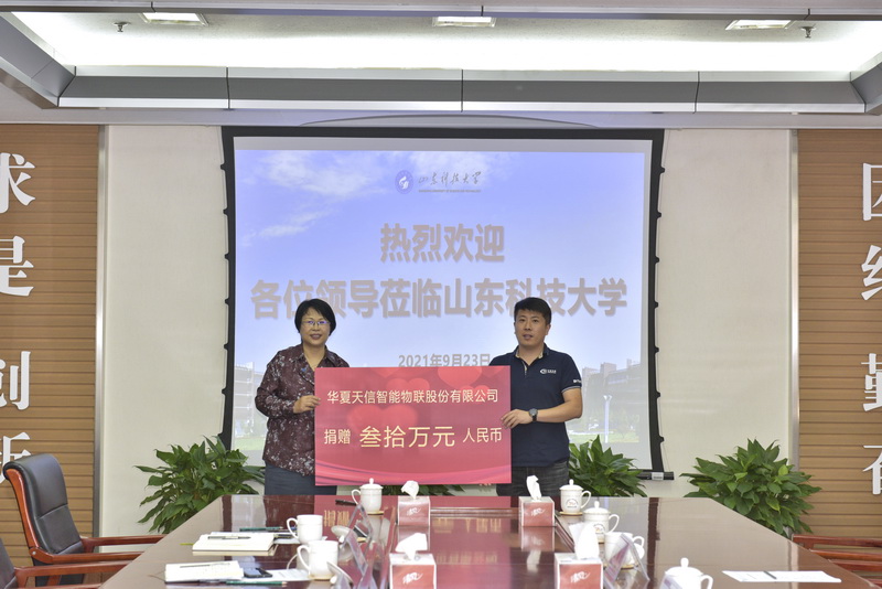 李玉霞代表学校接受了华夏天信智能物联股份有限公司的捐赠,并向张东岳回赠了捐赠致谢牌。科技处处长陈连军、华夏天信智能物联股份有限公司副总工程师安郁熙代表校企双方签署战略合作协议。