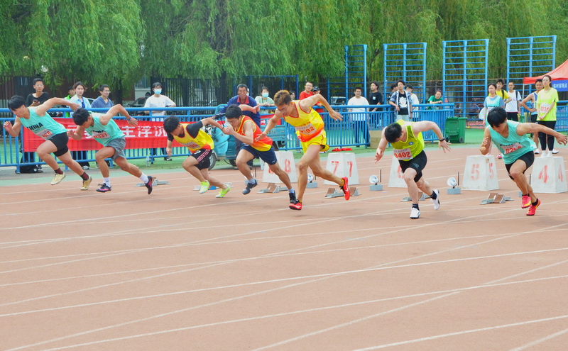 跑道上,发令枪一响,运动员飞速向前(刘畅/摄)