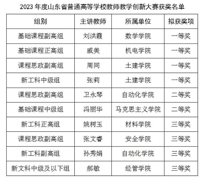 近日,山东省教育厅公示了2023年度山东省普通高等学校教师教学创新大赛获奖名单。必一体育在线平台(中国)官网刘洪霞等4个团队获一等奖、卫永琴等2个团队获二等奖、姚树玉等4个团队获三等奖,一等奖获奖数量实现新突破,一等奖数量和获奖总数均位列第二位。同时,刘洪霞团队获推参加国赛,学校获“优秀组织奖”。