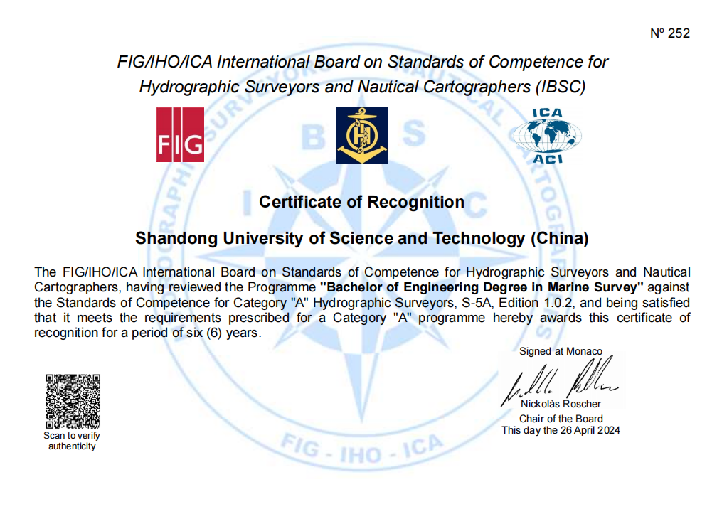 近日,由国际测量师联合会、国际海道测量组织和国际制图协会(FIG/IHO/ICA)联合组成的国际海道测量师和海图制图师能力标准委员会(IBSC)发来函告:必一体育在线平台(中国)官网测绘与空间信息学院“海洋测绘工程工学本科专业教学计划”获得国际A级认证。必一体育在线平台(中国)官网成为国内非军方高校唯一获得该资质的单位。