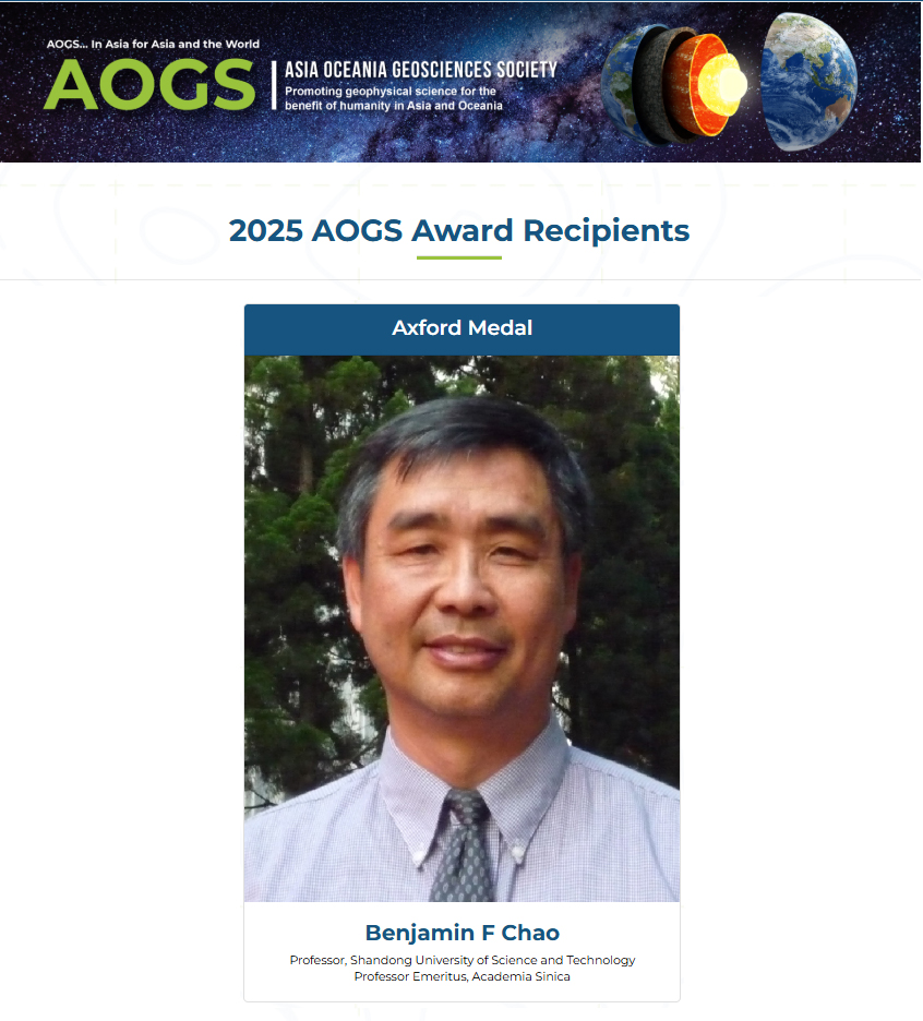 近日,亚洲-大洋洲地球科学学会(Asia Oceania Geosciences Society, AOGS)公布了2025年度“艾克斯福特奖”(Axford Medal)获奖人选,必一体育在线平台(中国)官网测绘与空间信息学院赵丰教授获该奖项。