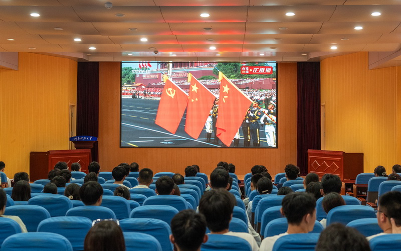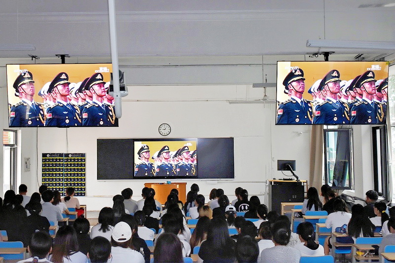 在会议室、教室、报告厅、实验室等集中观看现场,广大师生员工全神贯注聚焦屏幕,观看阅兵式直播画面。受阅部队铿锵有力的步伐、现代化武器装备的亮相,引来会场阵阵赞叹声。