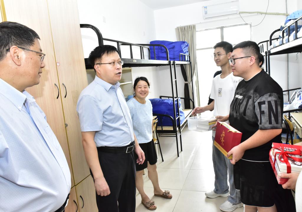 在青岛校区迎新现场,校党委书记王君松、校长曾庆田等校领导在相关部门负责人陪同下,详细了解新生报到和迎新工作情况。在安全学院学生宿舍,王君松与来自新疆的新生亲切交流,勉励新生尽快适应新的学习环境和生活节奏,早日成长成才,并为学生送上了学校精心准备的书籍《科大故事》、生活用品等爱心大礼包。在电信学院迎新点,曾庆田与新生亲切交流,了解新生报考专业情况和学习规划,表示学校将尽己所能提供好的条件,助力同学们安心学习,勉励新生以梦为马,不负韶华。