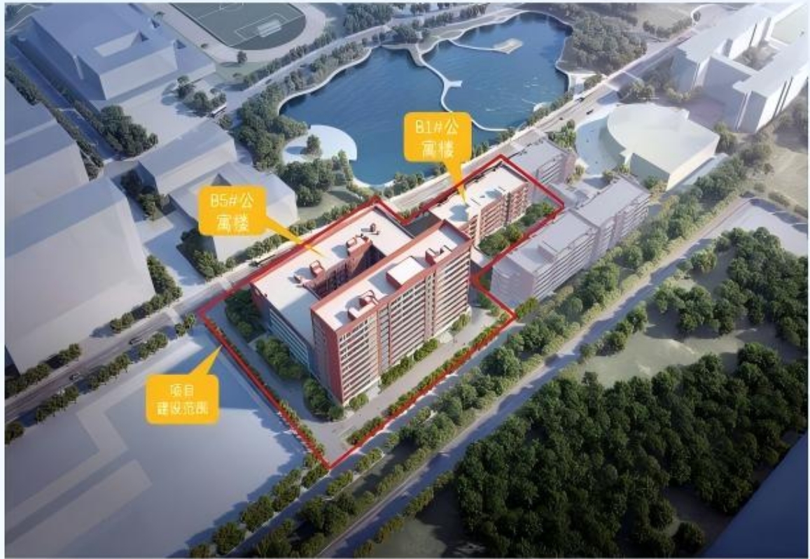 B1、B5 学生公寓项目总建筑面积4.7万余平方米,其中地上建筑面积4.1万平方米,地下部分6千余平方米。项目建成后,将有效缓解学生住宿资源紧张局面,显著提升学生居住品质。公寓公共空间合理设置为各类学生活动与交流场所,推动学生公寓实现从“居住”功能向“育人”功能的转型升级,更好地服务于学生的全面成长和学校的育人使命,为学校长远发展提供更加坚实的硬件保障。