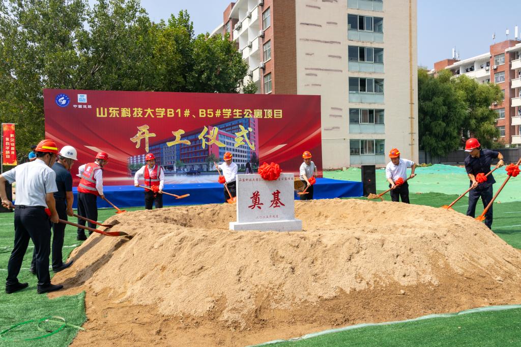 王君松、徐方全和各位领导、嘉宾共同为B1、B5学生公寓项目培土奠基,标志着该项目启动建设。