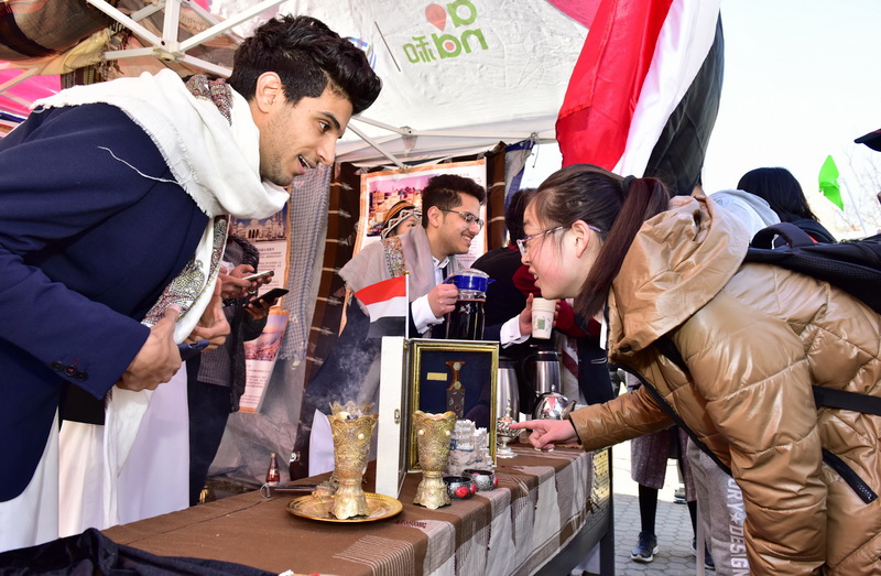 开幕式后,近千名中外大学生参加了艺术节异域风情游园活动。日本、德国、新加坡、法国、荷兰等国家的特色风俗文化以多种趣味形式大放异彩。现场,中外大学生身着各具特色的异域服装,设置了具有各国特色的丰富知识和趣味游戏,还精心准备了各国的美食,让“游客”品尝美食,观赏摆件,感受具有异域风情的舞蹈,通过参与互动,师生在美食和游戏中感受文化的融通。