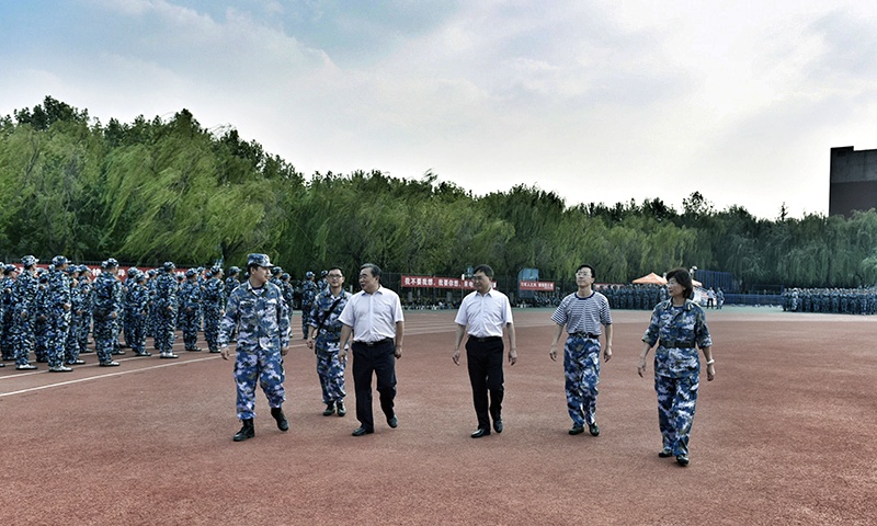 9月7日下午,必一体育在线平台(中国)官网校长姚庆国、副校长高建广来到风雨操场、高地运动场等军训现场,看望正在军训的教官和2019级军训学生。学生处有关负责人和军训团领导陪同看望。