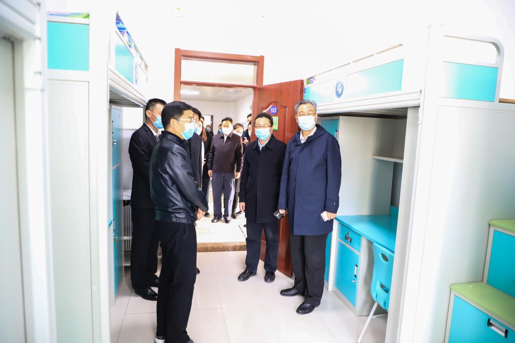 在考察现场,王少鹏向与会人员介绍了校区基本情况和新建公寓项目具体情况,并陪同参观了学生寝室、洗漱间、直饮水房、储物间、洗衣机房等。他介绍说,新建学生公寓建筑面积1.98万平方米,是擂鼓石大街中段贯通工程征收重建项目。项目采用装配式混凝土框架结构,极大地缩短了设计和施工周期。项目自2019年2月动工,5月封顶,8月交付使用,保证了2019级新生如期入住。