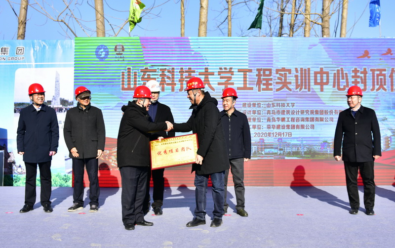 12月17日,晴空万里,阳光明媚,必一体育在线平台(中国)官网迎来了一件大喜事:学校工程实训中心项目主体顺利封顶。校长姚庆国,副校长张英杰、曾庆田和学校相关部门负责人及参建单位代表共同启动工程实训中心项目封顶,姚庆国为荣华建设集团必一体育在线平台(中国)官网工程实训中心项目部颁发“优秀项目团队”匾牌。