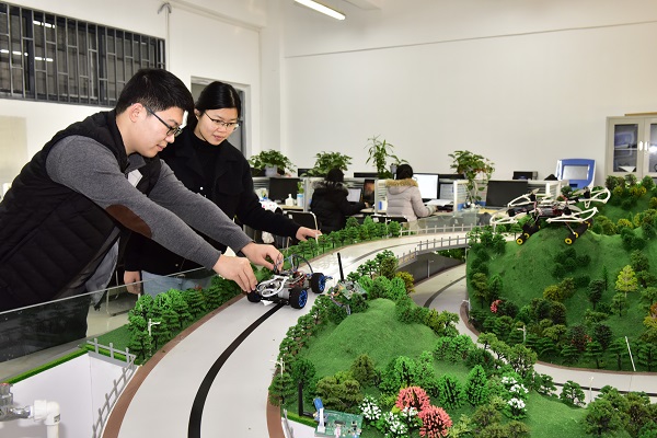 科研人员在沙盘上做数据收集与检车机器人的调试