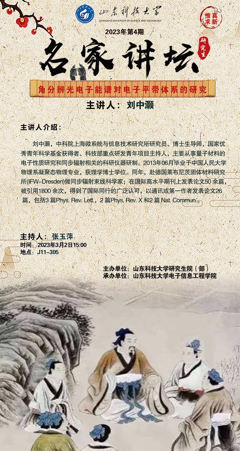 “名家讲坛”2023年第4期:角分辨光电子能谱对电子平带体系的研究(总805期)