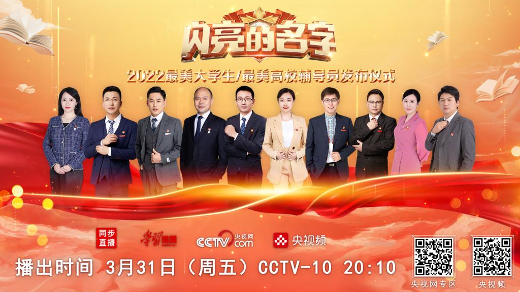 由中宣部、教育部、中央广播电视总台联合主办的《最美大学生/最美高校辅导员》发布仪式将于2023年3月31日(周五)20:10在央视科教频道(CCTV-10)播出。学习强国、央视网、央视频同步直播。