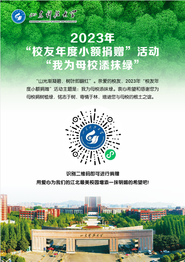 亲爱的校友,海不辞水成其大,山不辞土成其高。衷心希望广大校友积极参与2023年“我为校园添抹绿”主题捐赠活动,把对母校的爱化作行动,饮水思源,捐资助校。我们坚信,广大校友的这份情将激励一代又一代嵙大学子奋发向上,这份爱将化成支持母校发展的不竭动力,助推学校迈向新的辉煌!