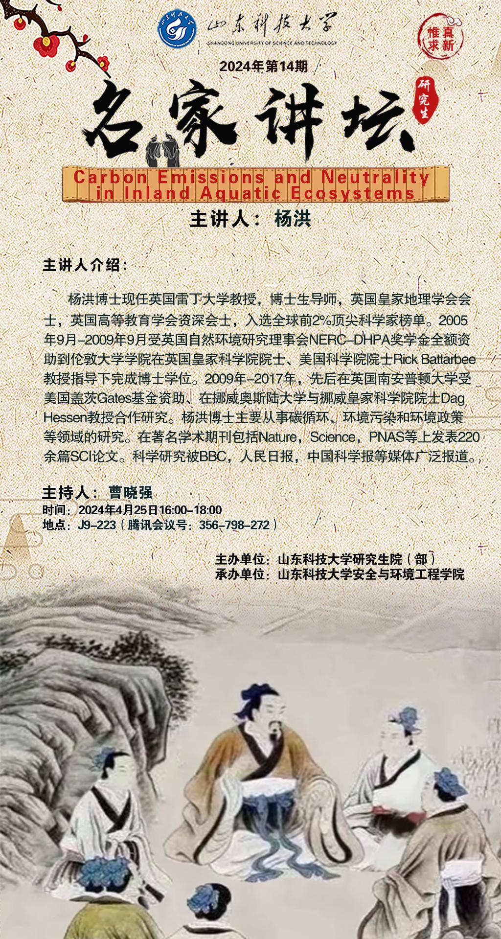 “名家讲坛”2024年第14期:Carbon Emissions and Neutrality in Inland Aquatic Ecosystems(总908期)