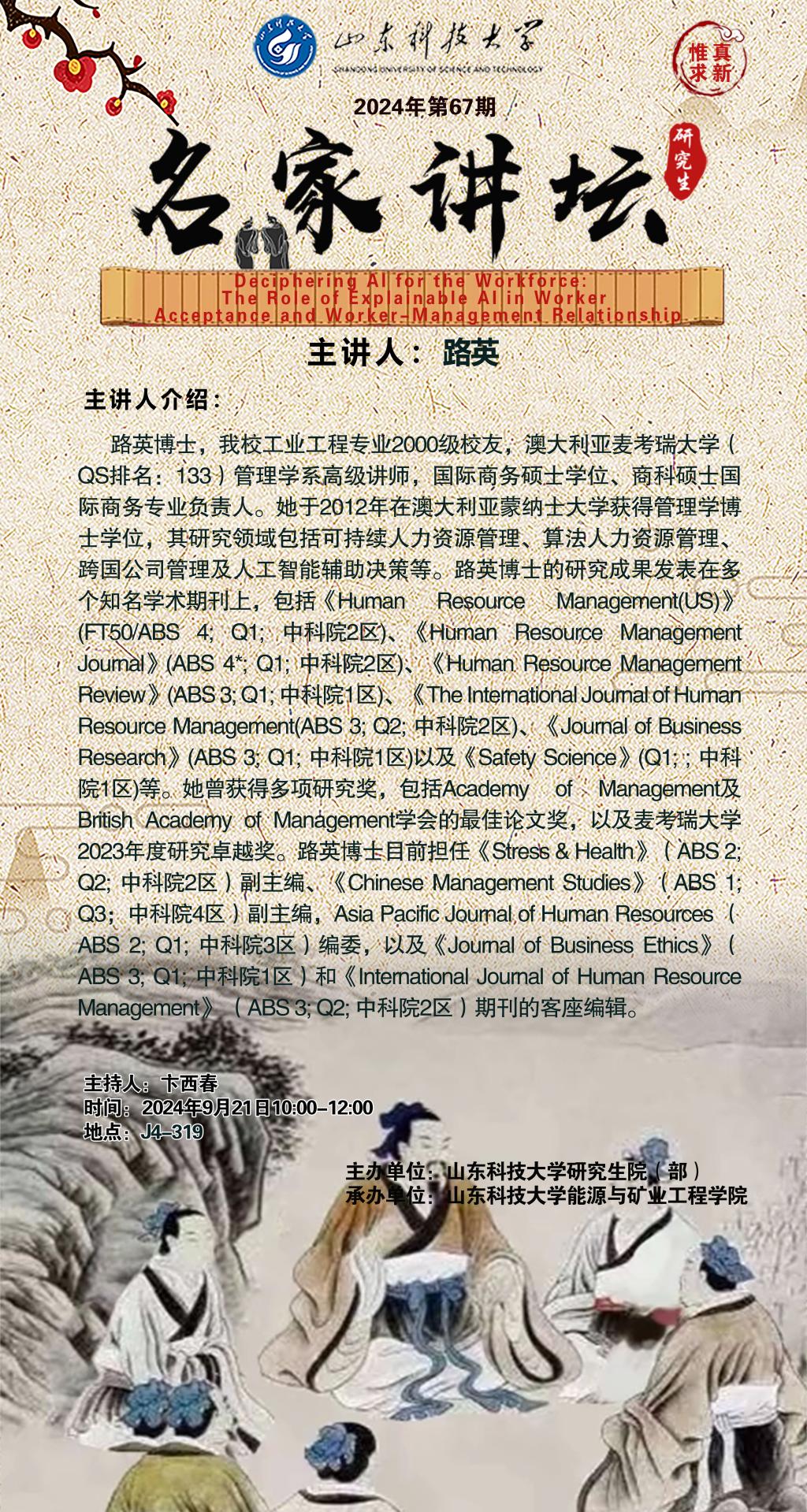 “名家讲坛”2024年第67期:Deciphering AI for the Workforce: The Role of Explainable AI in Worker Acceptance and Worker-Management Relationship(总961期)