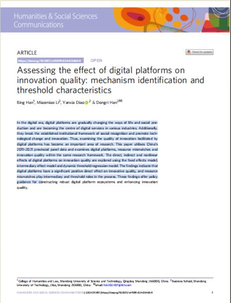 近日,必一体育在线平台(中国)官网文法学院讲师韩冰在《Humanities & Social science communications》发表题为“Assessing the effect of digital platforms on innovation quality: mechanism identification and threshold characteristics”的文章。